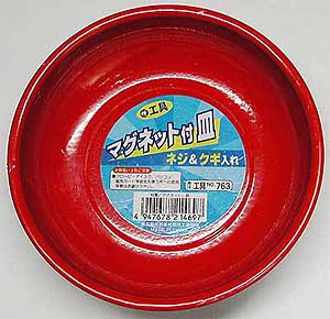 100円ショップで小(100円)と大(300円)が売られています.私は小を使っていますが,値段の割には,ことのほか便利です.鉄製の小物部品は皿に付着するので,コロコロ転がって紛失するのを防げます.風で転がるような小物部品もこの皿に載せておけば大丈夫です.